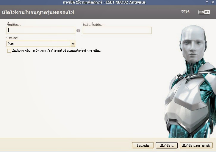 สำหรับข้อมูลที่คุณจะต้องกรอกเพื่อใช้ลงทะเบียน NOD32 นั้นจะต้องใส่ ที่อยู่อีเมล์ และยืนยันที่อยู่อีเมล์ หลังจากนั้นคุณจะต้องเลือกประเทศที่คุณพักอาศัยอยู่ปุ่ม “ฉันต้องการอัพเดทผลิตภัณฑ์หรือข้อเสนอพิเศษผ่านทางอีเมล์” ใครที่สนใจอยากรับข่าวสารจากทางผู้พัฒนาโปรแกรม NOD32 ก็คงจะต้องเลือกช่องนี้เอาไว้ด้วยละครับ